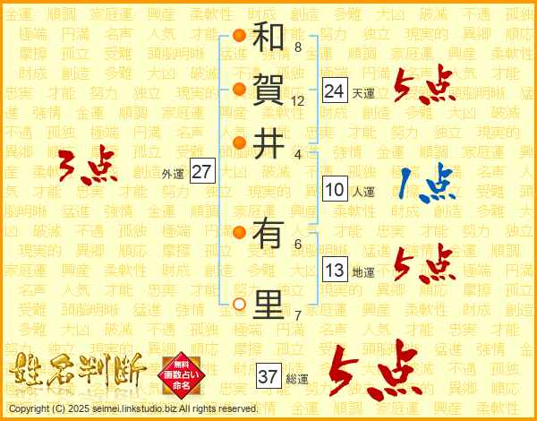 和(8画)賀(12画)井(4画) 有(6画)里(7画)