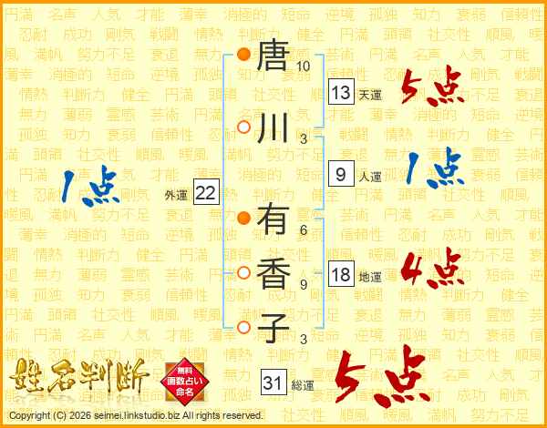 唐(10画)川(3画) 有(6画)香(9画)子(3画)