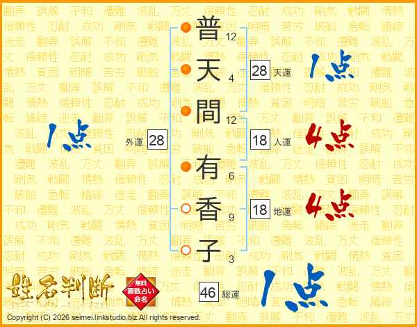 普(12画)天(4画)間(12画) 有(6画)香(9画)子(3画)