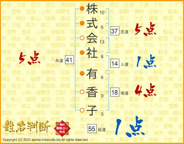 株(10画)式(6画)会(13画)社(8画) 有(6画)香(9画)子(3画)