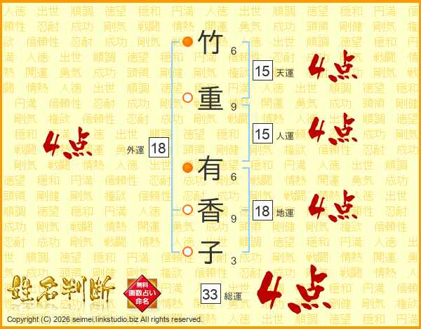竹重有香子さんの総運は33画の4点!