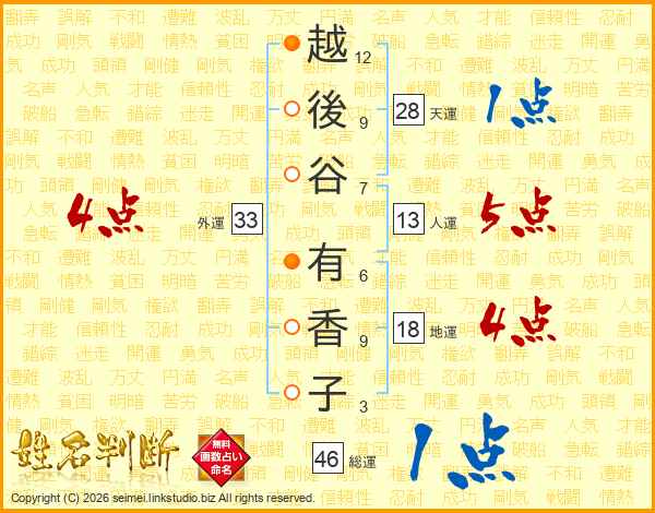 越(12画)後(9画)谷(7画) 有(6画)香(9画)子(3画)