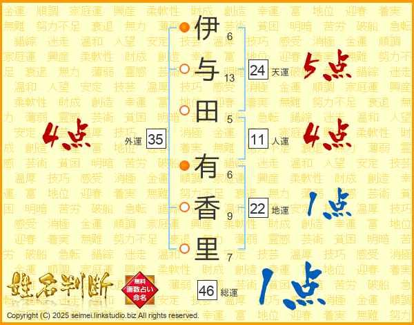 伊(6画)与(13画)田(5画) 有(6画)香(9画)里(7画)