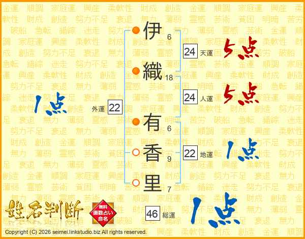 伊(6画)織(18画) 有(6画)香(9画)里(7画)