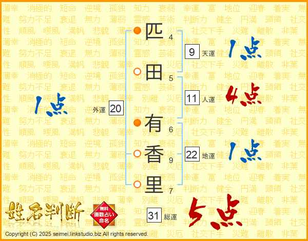 匹(4画)田(5画) 有(6画)香(9画)里(7画)
