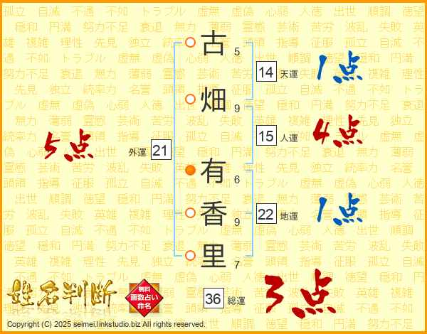 古(5画)畑(9画) 有(6画)香(9画)里(7画)