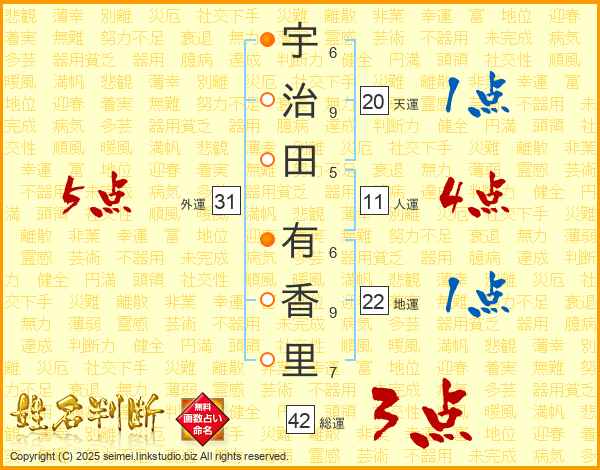 宇(6画)治(9画)田(5画) 有(6画)香(9画)里(7画)