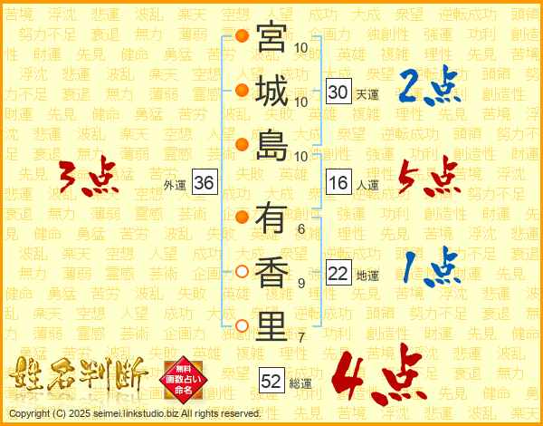 宮(10画)城(10画)島(10画) 有(6画)香(9画)里(7画)