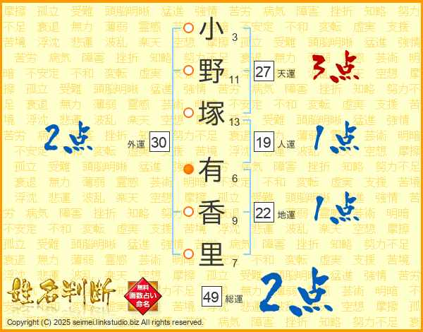 小(3画)野(11画)塚(13画) 有(6画)香(9画)里(7画)