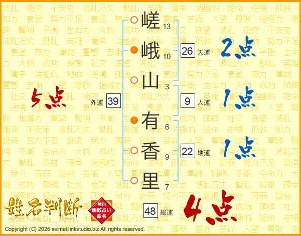 嵯(13画)峨(10画)山(3画) 有(6画)香(9画)里(7画)