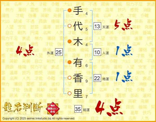 手(4画)代(5画)木(4画) 有(6画)香(9画)里(7画)