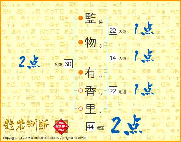 監(14画)物(8画) 有(6画)香(9画)里(7画)