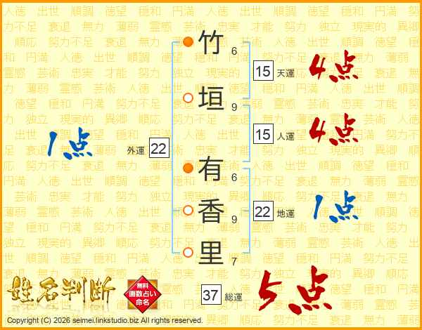 竹(6画)垣(9画) 有(6画)香(9画)里(7画)