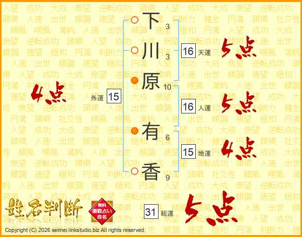 生活面を象徴する運勢です。外部から受ける影響力を表し、結婚運、家庭運や職場、環境への順応性を表します。総運から人運を引いた画数。姓や名が1文字の場合を除く。