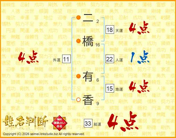 生活面を象徴する運勢です。外部から受ける影響力を表し、結婚運、家庭運や職場、環境への順応性を表します。総運から人運を引いた画数。姓や名が1文字の場合を除く。