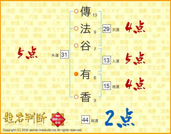 生活面を象徴する運勢です。外部から受ける影響力を表し、結婚運、家庭運や職場、環境への順応性を表します。総運から人運を引いた画数。姓や名が1文字の場合を除く。