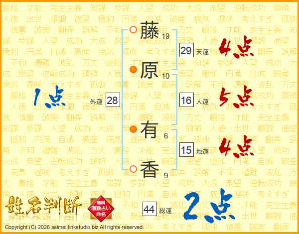 生活面を象徴する運勢です。外部から受ける影響力を表し、結婚運、家庭運や職場、環境への順応性を表します。総運から人運を引いた画数。姓や名が1文字の場合を除く。