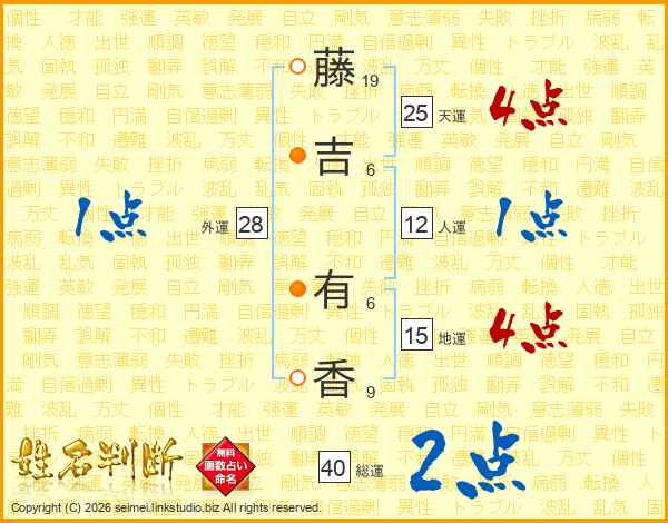 生活面を象徴する運勢です。外部から受ける影響力を表し、結婚運、家庭運や職場、環境への順応性を表します。総運から人運を引いた画数。姓や名が1文字の場合を除く。