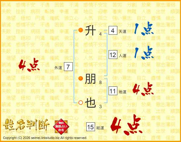 生活面を象徴する運勢です。外部から受ける影響力を表し、結婚運、家庭運や職場、環境への順応性を表します。総運から人運を引いた画数。姓や名が1文字の場合を除く。