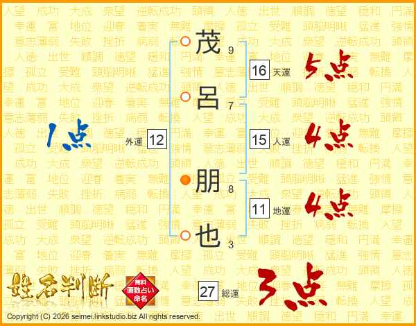 茂(9画)呂(7画) 朋(8画)也(3画)