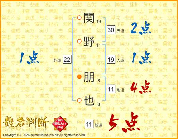 関(19画)野(11画) 朋(8画)也(3画)