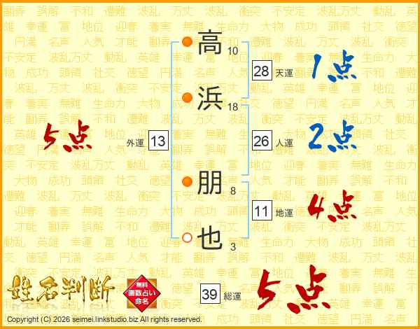 あなたの人生を表す1番重要な運勢です。生涯を通じて影響する総合運となり、主に50歳以降の晩年期に影響を及ぼします。苗字と名前の合計画数。