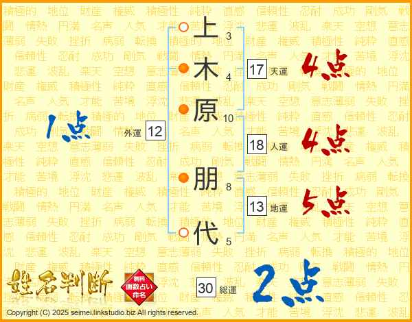 上(3画)木(4画)原(10画) 朋(8画)代(5画)