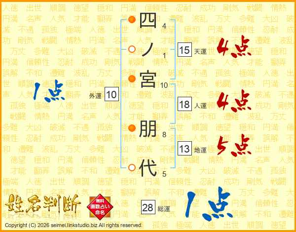 四(4画)ノ(1画)宮(10画) 朋(8画)代(5画)