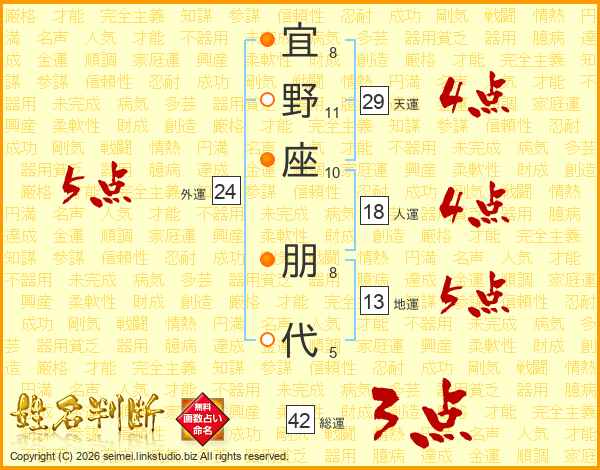 宜(8画)野(11画)座(10画) 朋(8画)代(5画)