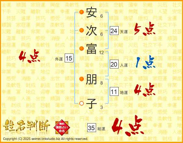 安(6画)次(6画)富(12画) 朋(8画)子(3画)