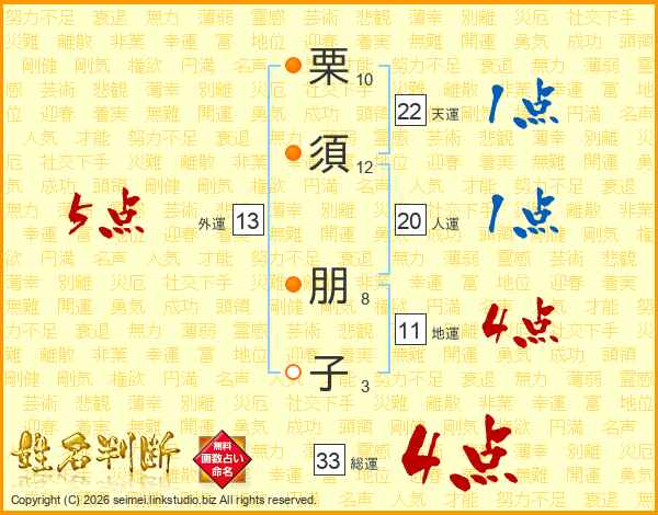 栗(10画)須(12画) 朋(8画)子(3画)