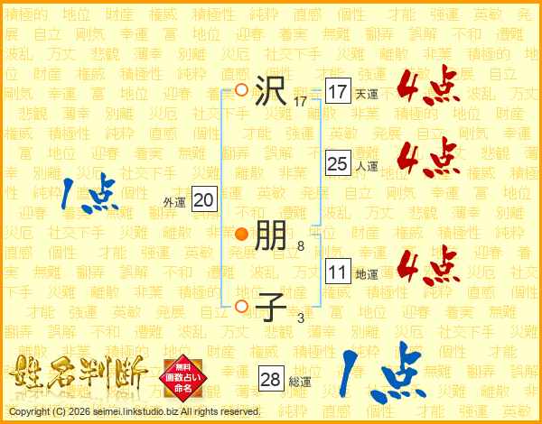 沢(17画) 朋(8画)子(3画)
