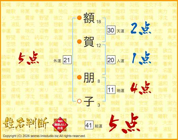 額(18画)賀(12画) 朋(8画)子(3画)