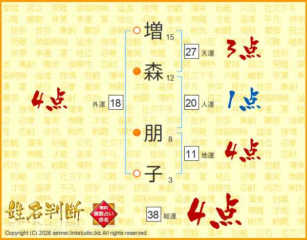 増(15画)森(12画) 朋(8画)子(3画)