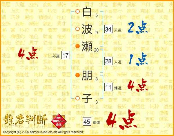 白(5画)波(9画)瀬(20画) 朋(8画)子(3画)