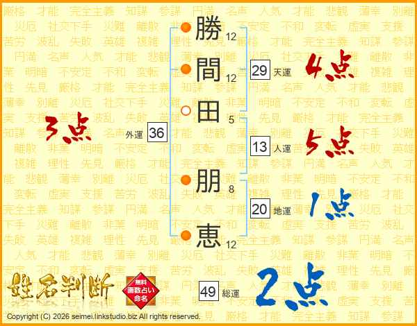 勝(12画)間(12画)田(5画) 朋(8画)恵(12画)