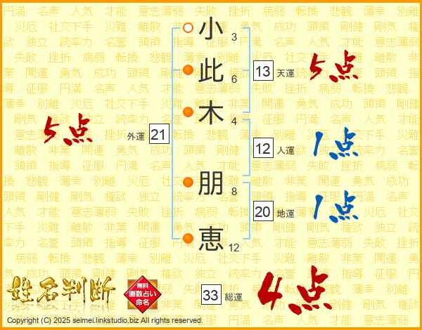 小(3画)此(6画)木(4画) 朋(8画)恵(12画)