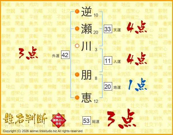 逆(10画)瀬(20画)川(3画) 朋(8画)恵(12画)