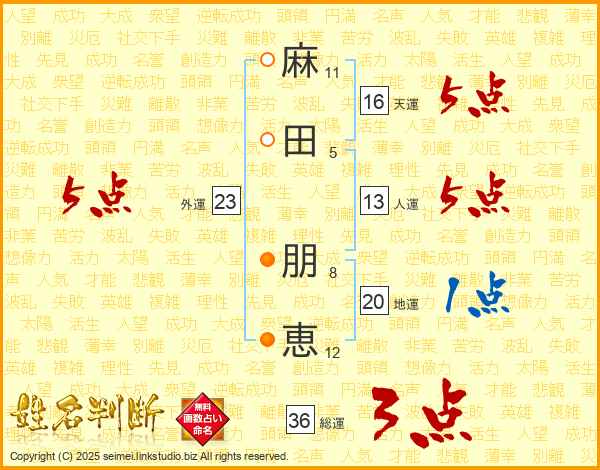 麻(11画)田(5画) 朋(8画)恵(12画)
