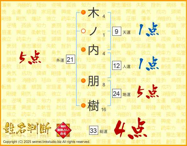 木ノ内朋樹さんの総運は33画の4点!