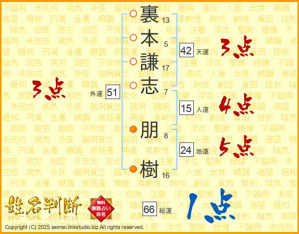 裏(13画)本(5画)謙(17画)志(7画) 朋(8画)樹(16画)