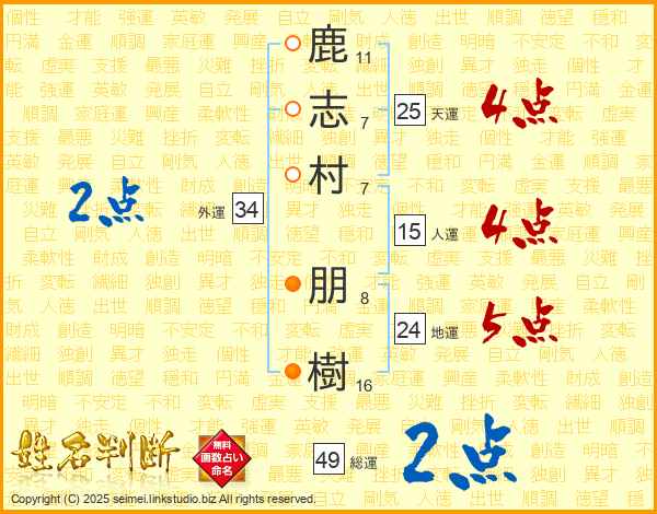 鹿(11画)志(7画)村(7画) 朋(8画)樹(16画)