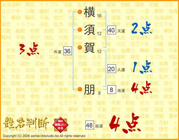 生活面を象徴する運勢です。外部から受ける影響力を表し、結婚運、家庭運や職場、環境への順応性を表します。総運から人運を引いた画数。姓や名が1文字の場合を除く。