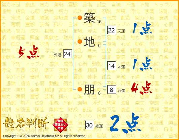 生活面を象徴する運勢です。外部から受ける影響力を表し、結婚運、家庭運や職場、環境への順応性を表します。総運から人運を引いた画数。姓や名が1文字の場合を除く。