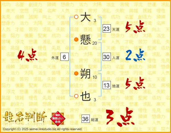あなたの人生を表す1番重要な運勢です。生涯を通じて影響する総合運となり、主に50歳以降の晩年期に影響を及ぼします。苗字と名前の合計画数。