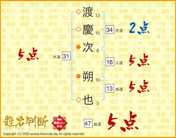 渡(13画)慶(15画)次(6画) 朔(10画)也(3画)