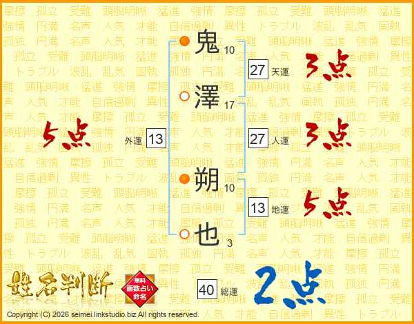 鬼澤朔也さんの外運は13画の5点!