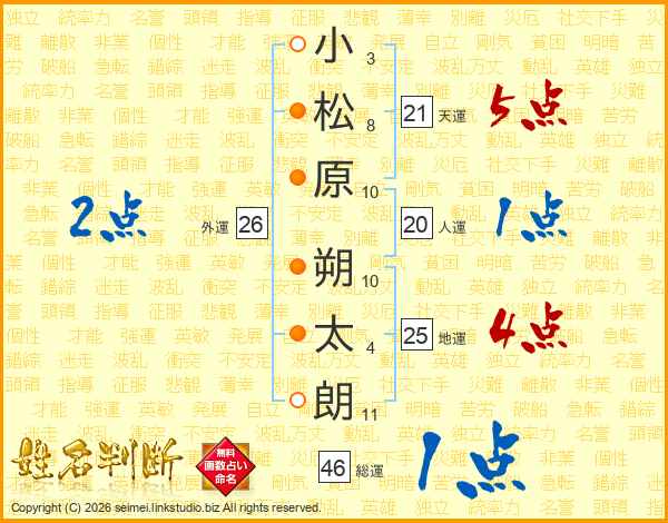 小松原朔太朗さんの天運は21画の5点!