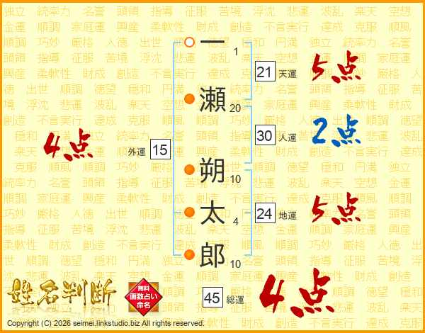 一(1画)瀬(20画) 朔(10画)太(4画)郎(10画)