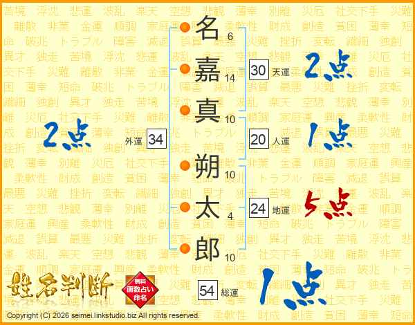 名(6画)嘉(14画)真(10画) 朔(10画)太(4画)郎(10画)